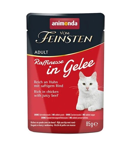 Vyvážené kompletní vlhké krmivo pro dospělé kočky z kuřecího a hovězího masa v kapsičce. Obsahuje kousky masa ve výtečné želé omáčce a podporuje dobrou kondici doplněným taurinem pro zrak a srdce, a vitamínem D3 pro zdravé a pevné kosti. Receptura krmiva je zcela bez sóji, přidaného cukru, barviv, dochucovadel a konzervantů.