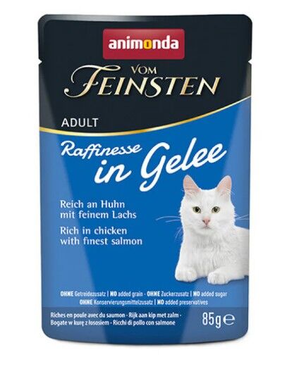 Vyvážené kompletní vlhké krmivo pro dospělé kočky z kuřecího a lososího masa v kapsičce. Obsahuje kousky masa ve výtečné želé omáčce a podporuje dobrou kondici doplněným taurinem pro zrak a srdce, vitamínem D3 pro zdravé a pevné kosti a vitamínem E pro zdravou imunitu. Receptura krmiva je zcela bez sóji, přidaného cukru, barviv, dochucovadel a konzervantů.