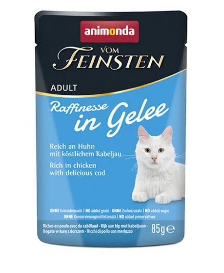 Kompletní a výživné vlhké krmivo pro dospělé kočky z kuřecího masa a tresky. Obsahuje kousky masa ve výtečné želé omáčce s doplněným taurinem - pro zrak a srdce, vitamínem D3 pro zdravé a pevné kosti a vitaminem E pro zdravou imunitu. Receptura krmiva je zcela bez sóji, přidaného cukru, barviv, dochucovadel a konzervantů. Více informací