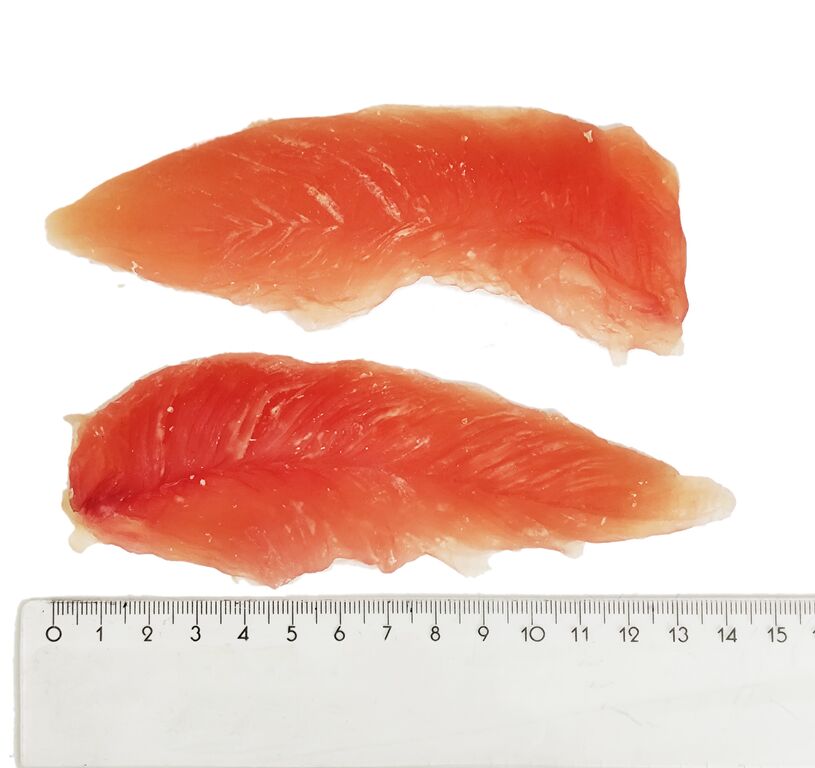 Pamlsek není vyroben ze separátu, ale jedná se opravdu o kus usušené svaloviny. Výrobek je pevný a při pokusu o utržení odhalí, že jej lze trhat pouze po masových vláknech.