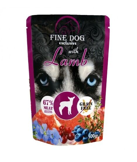FINE DOG XXL kapsa je prémiové kompletní krmivo pro psy s jehněcím masem. Chutné a vyvážené vlhké krmivo pro psy je vhodné zejména pro střední a velká plemena. Šťavnatá kapsa obsahuje vysoký podíl masa, které je doplněno o funkční složky, jako jsou brusinky, borůvky a důležité vitamíny a minerály, které podporují celkové zdraví psa. Praktické XXL balení 500 g zajistí dostatečnou porci i snadné dávkování, představuje skvělý poměr ceny a množství.