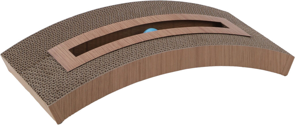 Ekologické škrabadlo z tvrdé lepenky je recyklovatelné nebo spalitelné. Škrabadlo je v podstatě vyrobeno z vrstvy lepenky prohnuté do oblouku. Uprostřed škrabadla je dráha, v které běhá malý míček s rolničkou. Boky a rám dráhy je potištěnými hnědým dekorem dřeva. Ke škrabadlu je přiložen sáček s catnipem (šantou kočičí), aby bylo škrabadlo pro kočku přitažlivější.