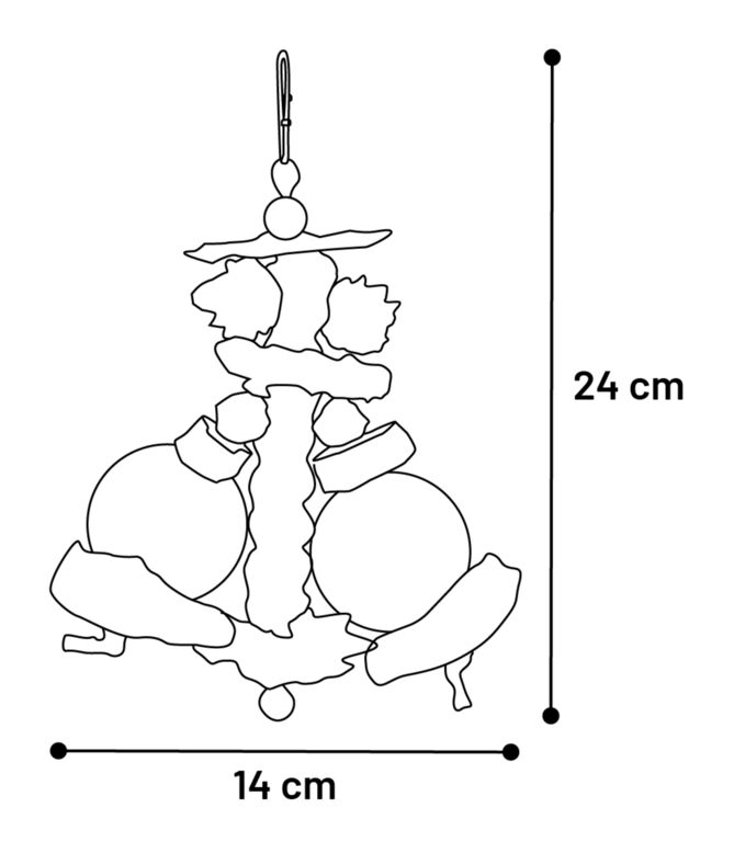Přírodní závěsná hračka pro středně velké papoušky obstará zábavu i stimulaci. Je vyrobena z bezpečných přírodních materiálů v zábavném tvaru. Hračka kombinuje různé přírodní materiály a textury. Podporuje přirozené chování ptáků, jako je šplhání, okusování a objevování. Tím je podpořena nejen fyzická ale i mentální aktivita.