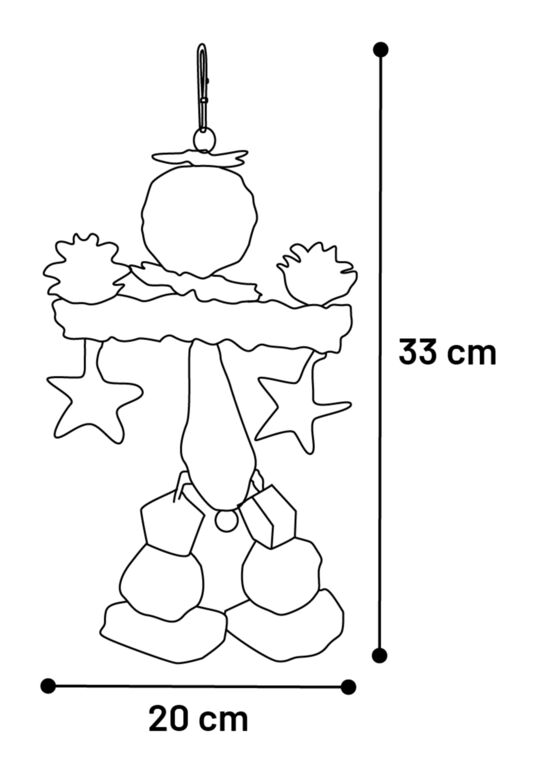 Přírodní závěsná hračka pro středně velké papoušky se postará o zábavu i stimulaci. Je vyrobena z bezpečných přírodních materiálů uspořádaných do zábavného tvaru panáčka. Hračka kombinuje různé přírodní materiály a textury. Podporuje přirozené chování ptáků, jako je šplhání, okusování a objevování. Tím je podpořena nejen fyzická ale i mentální aktivita.