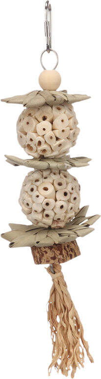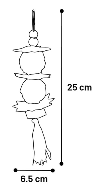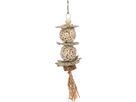 Přírodní závěsná hračka poskytuje vašemu papouškovi zábavu i stimulaci. Je vyrobena z bezpečných přírodních materiálů ve stylovém tvaru. Jemné přírodní odstíny béžové a hnědé dělají z hračky dekoraci klece. Závěs pobaví andulky a menší papoušky.
