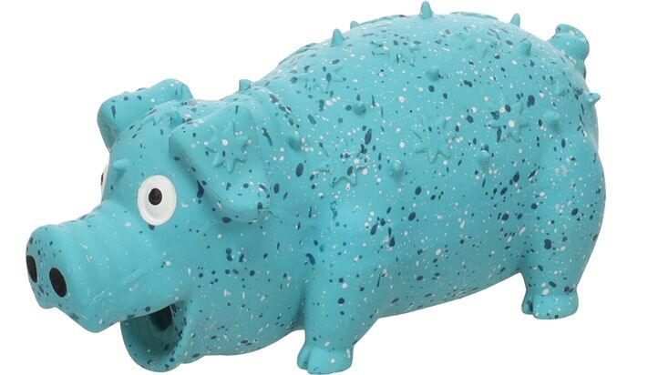 Rozkošné prasátko z latexu s chrochtavým zvukem je perfektním parťákem pro vašeho psa. Váš čtyřnohý kamarád si užije spoustu zábavy. Prasátko je lehké, měkké s hebkým povrchem. Uvnitř je vyplněno polyesterovým vláknem. Na povrchu hračky jsou vylisované reliefní hvězdičky a pružné výstupky, které při kousání zlepšují dentální hygienu psa. Troubítko má prasátko v tlamičce. Barva působí mramorově, protože kombinuje bílé a modré tečky v tyrkysové barvě.
