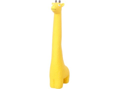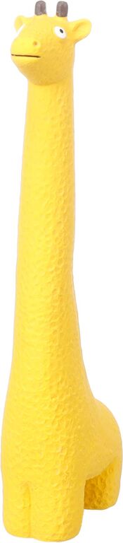 Dlouhá hračka pro psa, která se výborně nosí v tlamě. Svým podlouhlým štíhlým tvarem může připomínat klacek, ale je o poznání lehčí a měkčí a hlavně píská. Zvuk motivuje psa k další hře. Žirafa má zdrsněný povrch jemnými proslisy. Při kousání tak poskytne psovi i nový hmatový zářitek a masíruje jeho dásně. Za její dlouhý krk ji bude váš pejsek rád nosit všude s sebou. Zářivou žlutou barvu oceníte při hledání hračky v trávě nebo i bytě.
