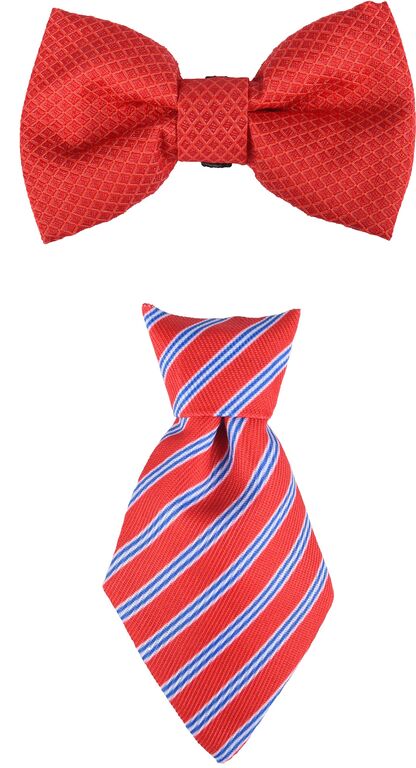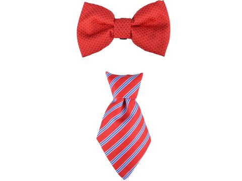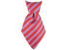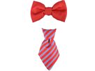 Červený motýlek s vyšívaným vzorem kosočtverců či kravata se šikmými pruhy v modré, bílé a červené barvě se snadno navlékají na obojek skrze pružné očko z gumičky.