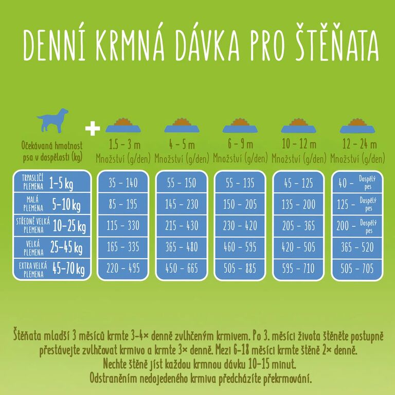 Krmný návod: Krmné dávky jsou určené pro středně aktivní štěňata v přirozeném prostředí. Individuální potřeby se mohou lišit. Doporučenou krmnou dávku (viz. tabulka) lze upravit dle hmotnosti, akvitity a vitality psa. Pes krmený suchým granulovaným krmivem by měl mít neustálý přístup k pitné vodě.
