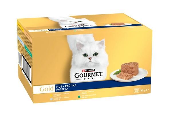 Malé konzervy pro kočky Gourmet gold představují opravdu kvalitní krmivo pro kočky. Obsahují právě jednu krmnou dávku (snídaně, oběd a večeře). Zvolte Gourmet gold a jednou pro vždy se zbavte otevřených nedojezených či zapomenutých konzerv v lednici, jejíž oschlý obsah vaše kočka nechce jíst. Každá konzervička je spotřebována jako jeden hlavní chod. Vyberte si z několika variant obsahu konzervy Gourment gold! Jemné výtečné jednodruhové paštiky nebo dvoudruhové kousky ve šťávě i v grilované úpravě,variantu se špenátem nebo s rajskou omáčkou. Masové kousky vypadají jako maso lisované do kousků ve kterých jsou patrna svalová vlákna. Nejedná se tedy o masové knedlíčky jaké znáte z levných konzerv pro kočky. Kvalitní ingredience a zpracování i velký výběr chutí řadí tyto konzervy do předních pozic oblíbenosti mezi chovateli koček. Pokud si vaše kočka zvykne na Gourmet gold, již velmi nerada bude chtít přejít na jinou značku konzerv pro kočky.