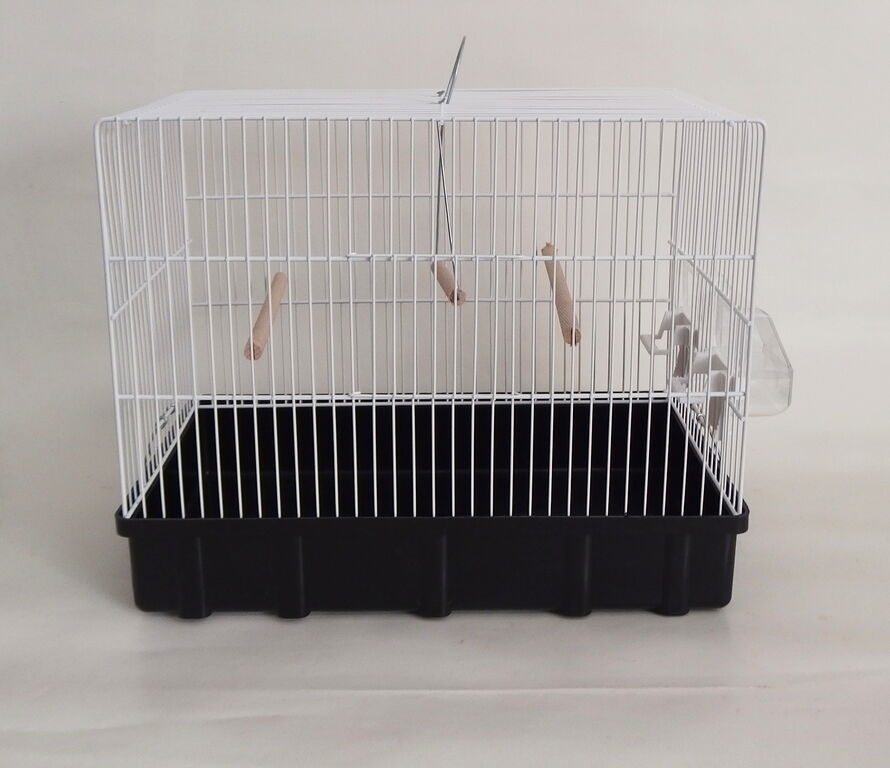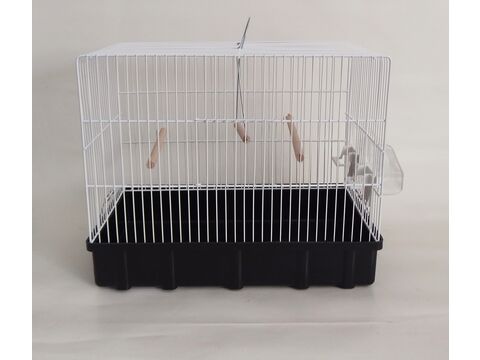 Stabilní celosvařovaná klec s tenkými mřížemi o rozteči 1,5 cm. Dvířka jsou pouze čelní posuvná nahoru. Krmítko s napaječkou jsou vně z boku klece.