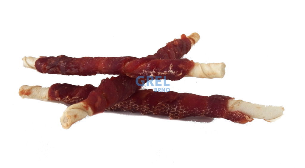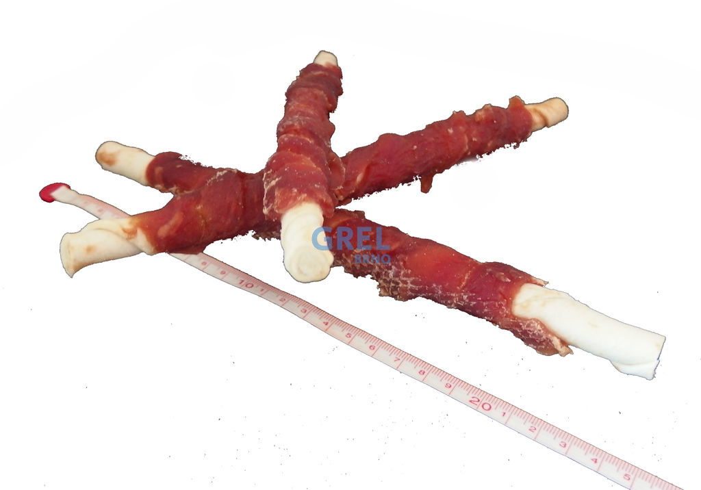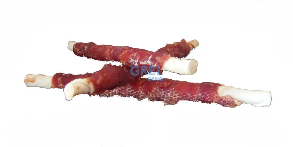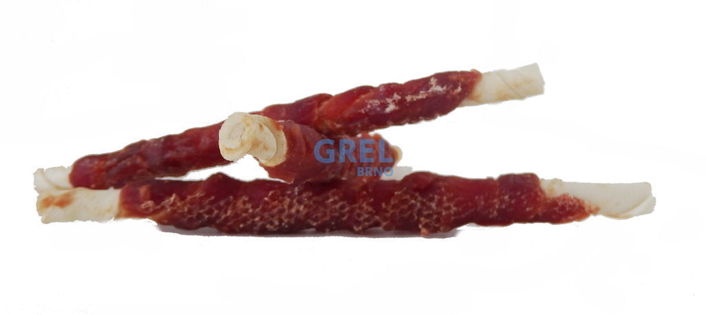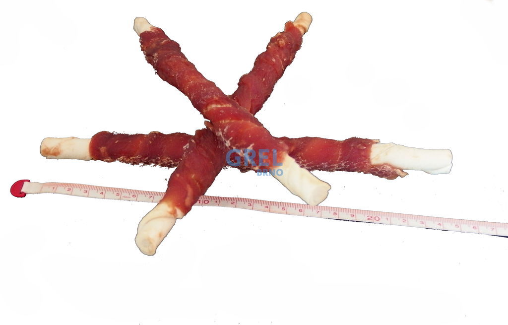 Přírodní pochoutka z masa. I když většina psů nepohrdne buvolí tyčinkou proč nezkusit něco lepšího? Klasická bílá buvolí tyčinka cca 25cm dlouhá s kachním masem. Kousek kachního masa byl namotán na tyčinku z buvolí kůže a usušen. Jasně viditelná masová vlákna nás přesvědčí o kvalitě psího pamlsku. Maso je k tyčince pevně fixováno, přischlé , nedrolí se a neopadává. Pevná, oblíbená žvýkací odměna, která na zabaví na dlouho. Vhodné i pro velké psy.