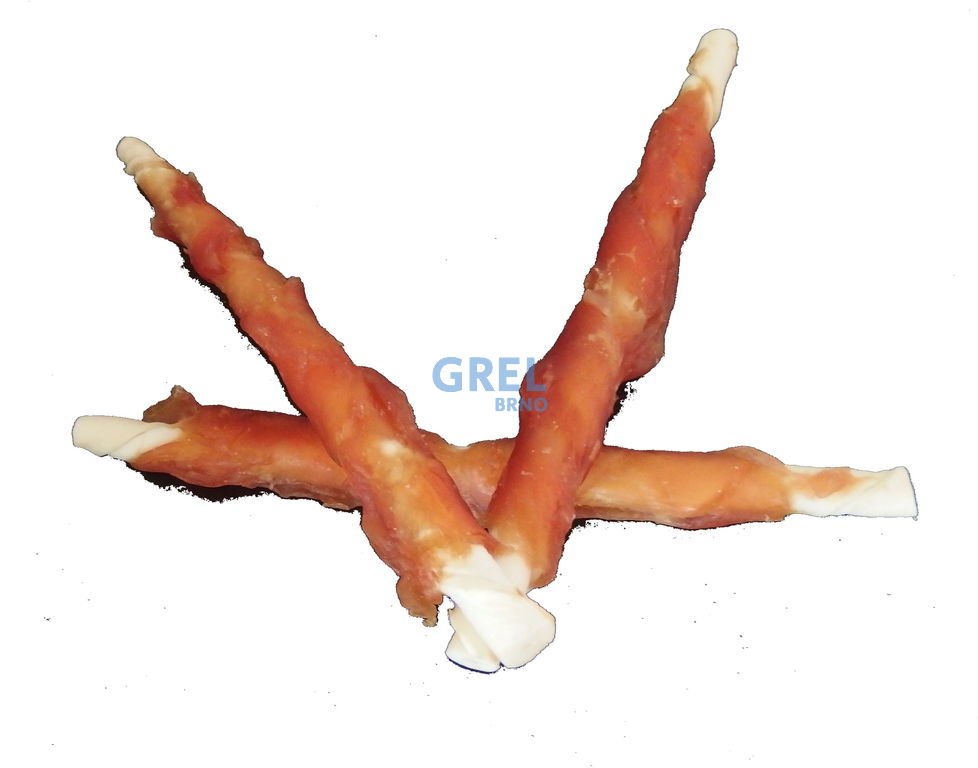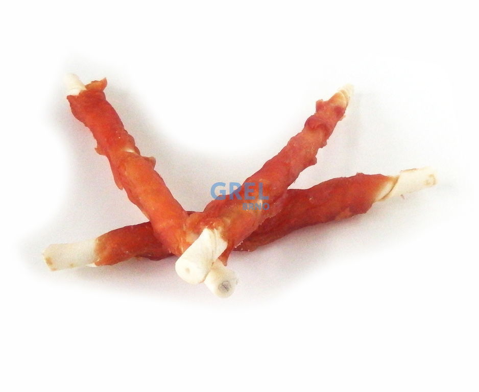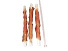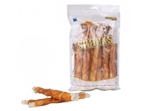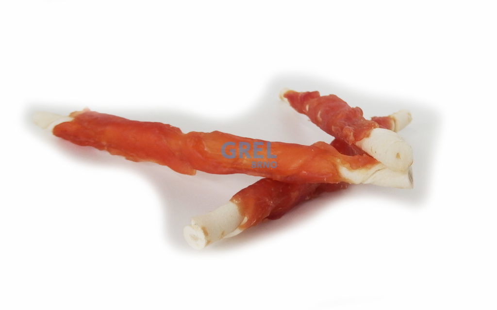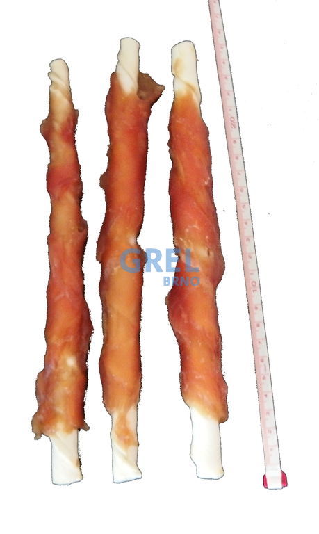 Přírodní pochoutka z masa. I když většina psů nepohrdne buvolí tyčinkou proč nezkusit něco lepšího? Klasická bílá buvolí tyčinka cca 25cm dlouhá s kuřecím masem. Kousek kučecího masa byl namotán na tyčinku z buvolí kůže a usušen. Jasně viditelná masová vlákna nás přesvědčí o kvalitě psího pamlsku. Maso je k tyčince pevně fixováno, přischlé , nedrolí se a neopadává. Pevná, oblíbená žvýkací odměna, která zabaví na dlouho. Vhodné i pro velké psy