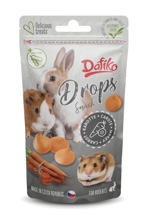 Doplňkové krmivo pro hlodavce s karotenem, slouží jako odměna, pamlsek pro vaše morčátko, křečka či králíka. Pamlsek pro hlodavce – drops, zpestří vašemu hlodavci či králíčkovi hlavní krmivo. Dropsem odměníte morče za zapískání na přivítanou, potkana za naučený trik a křečka za to, že neutekl. Vzhledem k vysokému obsahu tuku podávejte jen max. 1 - 3 ks/ den. Pochoutky jsou balené v uzavíratelném obalu, aby vydržely déle čerstvé.