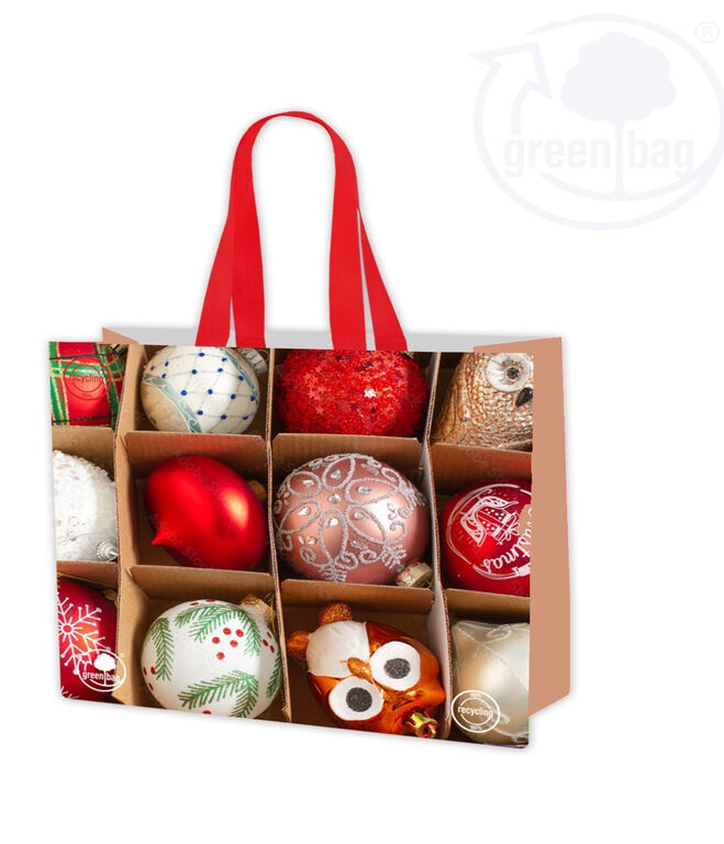 Taška je pevná, s dnem rozložitelným do obdélníku, nenaplněná nestojí. Uši jsou vyrobené ze stejného materiálu jako taška, dlouhé cca 20 cm. Taška není sešívaná - všechny spoje jsou svařované. S veselým vánočním potiskem.