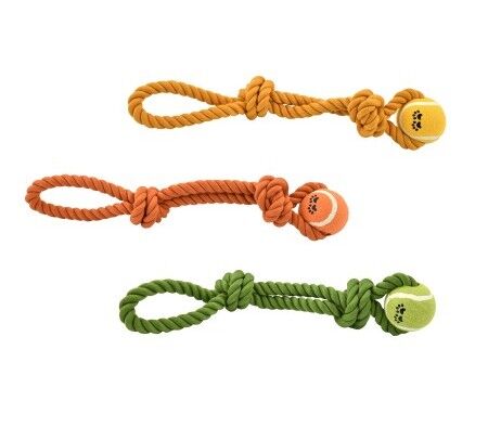 Hračka pro psy ze silného bavlněného lana o tloušťce 2 cm s recyklovanou přízí uvnitř a tenisového míčku o průměru 7 cm . Lano prochází díravým tenisákem a tvoří oko. Za tenisákem a uprostřed lana jsou silné uzly. Na konci lano tvoří velké oko pro držení.