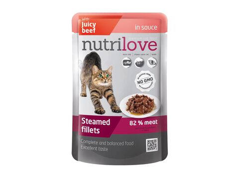 Nutrilove kapsa 85 g pro kočky, dušené filetky se šťavnatým hovězím