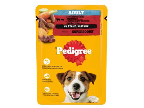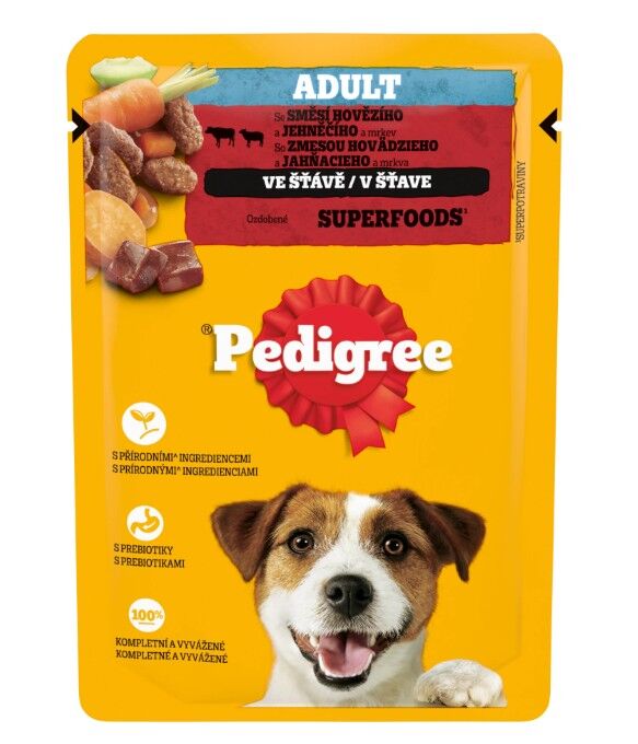 Kompletní mokré krmivo pro dospělé psy, to jsou kapsičky Pedigree s hovězím a jehněčím s mrkví ve šťávě. Složení vyváženého krmiva je obohaceno o superpotraviny. Jablka jsou bohatá na vitamín C a vlákninu, sladké brambory - batáty jsou zdrojem draslíku. Krmivo podporuje přirozenou obranyschopnost díky přidanému vitamínu E a antioxidantům. Obsahuje prebiotika pro podporu trávení a zdravé mikroflóry.