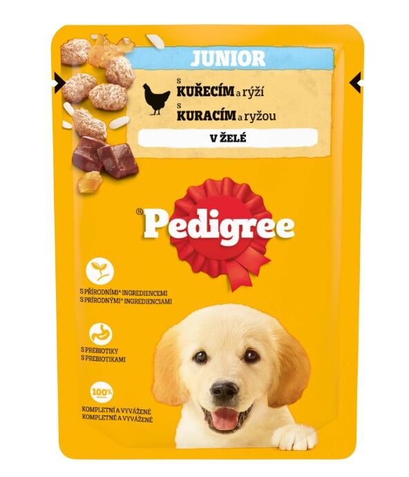 Kapsička pedigree junior s masovými knedlíčky z kuřecího masa s rýží v želé může dochutit granule junior pro štěňata nebo sloužit jako samostatné plnohodnotné krmivo. Složení vyváženého krmiva podporuje přirozenou obranyschopnost díky přidanému vitamínu E a D3. Podporuje optimální trávení a obsahuje vyvážené množství vápníku a fosforu pro zdravý růst a pevné kosti. Vyrobeno z pečlivě získaných surovin.