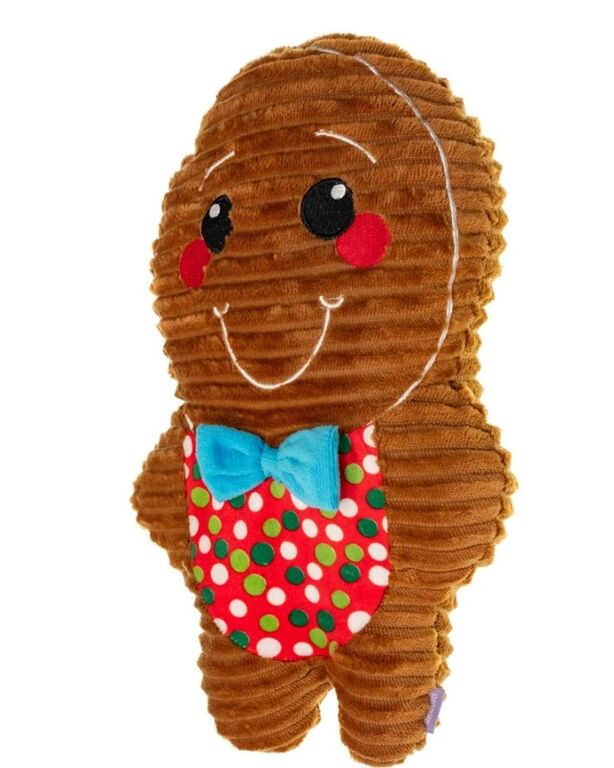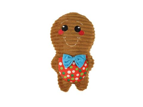 Plyšová hračka pro psa je měkká a připomíná perníček. Perníček táta má přišitého modrého motýlka pod krkem a červené bříško s barevnými puntíky. Hračka je vyrobena z vroubkovaného plyše podobně jako mačestr.