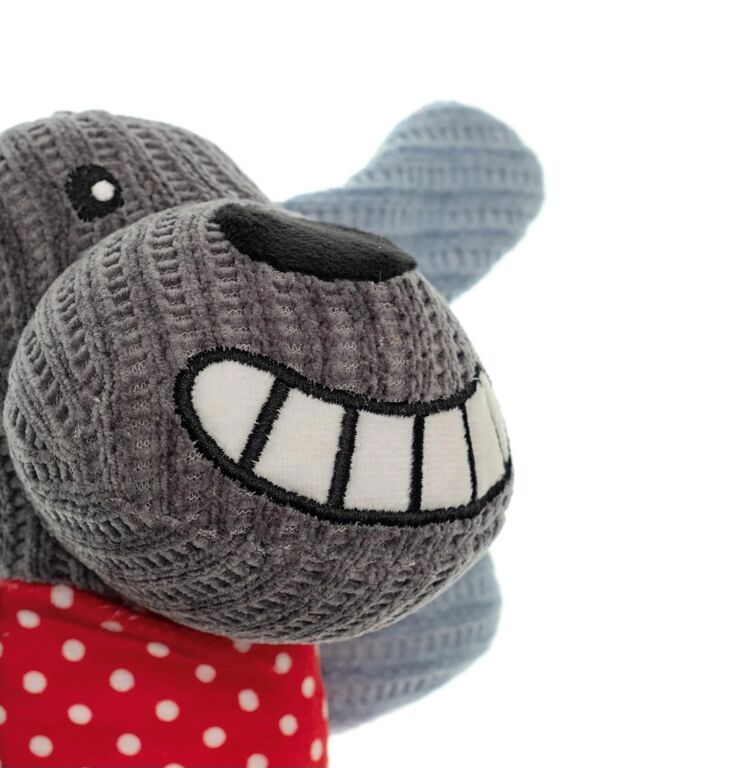 Pejsek má povrch těla ze strukturovaného plyše připomínající pleteninu. Na hlavě psa zaujme široký vyšívaný úsměv, oči jsou také vyšívané. K vydatně vyplněné hlavě jsou přišity plandavé uši bez výplně. Tělo je ušito z červené puntíkaté sametové látky v kombinaci s plyšem a měkce vyplněno, tak jako přišité tlapky. Uvnitř hlavy je ukryto pískátko, které stimuluje zájem psa o hru a podporuje jeho interakci.