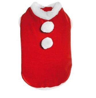 Vánočně laděný obleček pro psa v červené barvě s bílým plyšovým lemem kolem krku, otvoru pro přední nohy a na konci. Na zádech má 2 bílé bambulky. Látka je slabá sametově hebká. V zadní části jsou očka z černé gumy pro provlečení nohou a ocasu. Obleček se rozepíná na hrudi na suchý zip. Látka je slabá. Více informací
