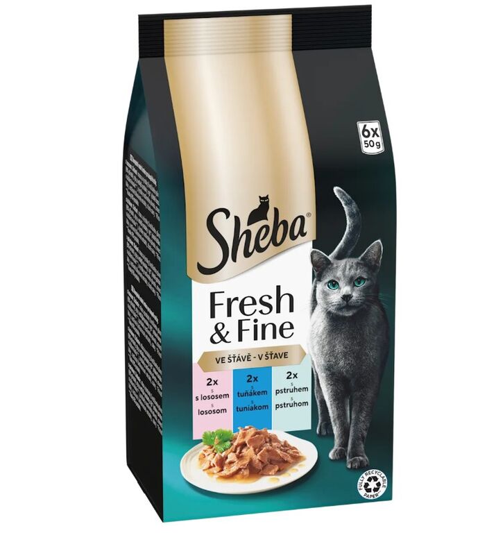 Kompletní mokré krmivo pro dospělé kočky. Balení obsahuje mix kapsiček s příchutí rybího masa (losos, tuňák a pstruh) ve šťávě. Sheba Fresh & Fine je zaměřená na vytvoření výtečné prémiové chuti, které kočky neodolají. Opravdové kočičí labužníky nadchnou drobně nakrájené kousky masa zalité krémovou šťávou.Kapsička je ideální porce jednoho denního chodu, díky tomu můžete podávat vždy čerstvé jídlo.