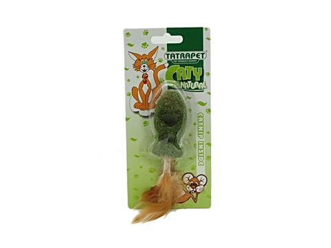 Přírodní hračka pro kočky je tvořená rybičkou z catnipu, která má na konci připevněná peříčka .Hračka nevydává zvuk. Kočku zaujme jemný pohyb peříček a vůně cetnipu.