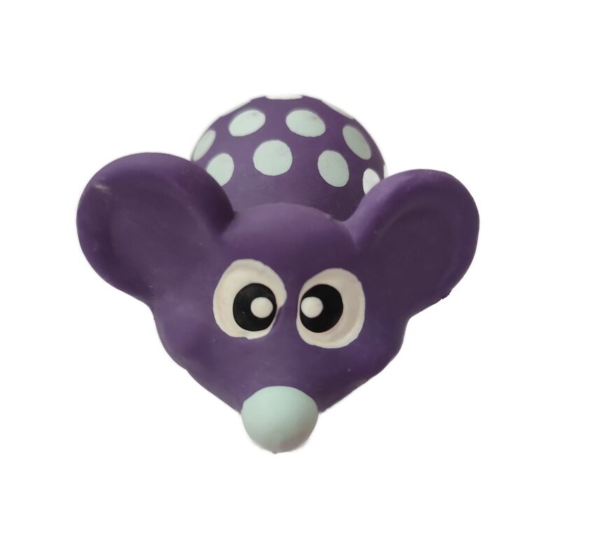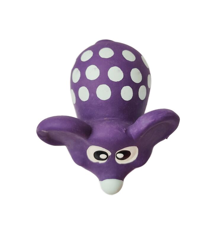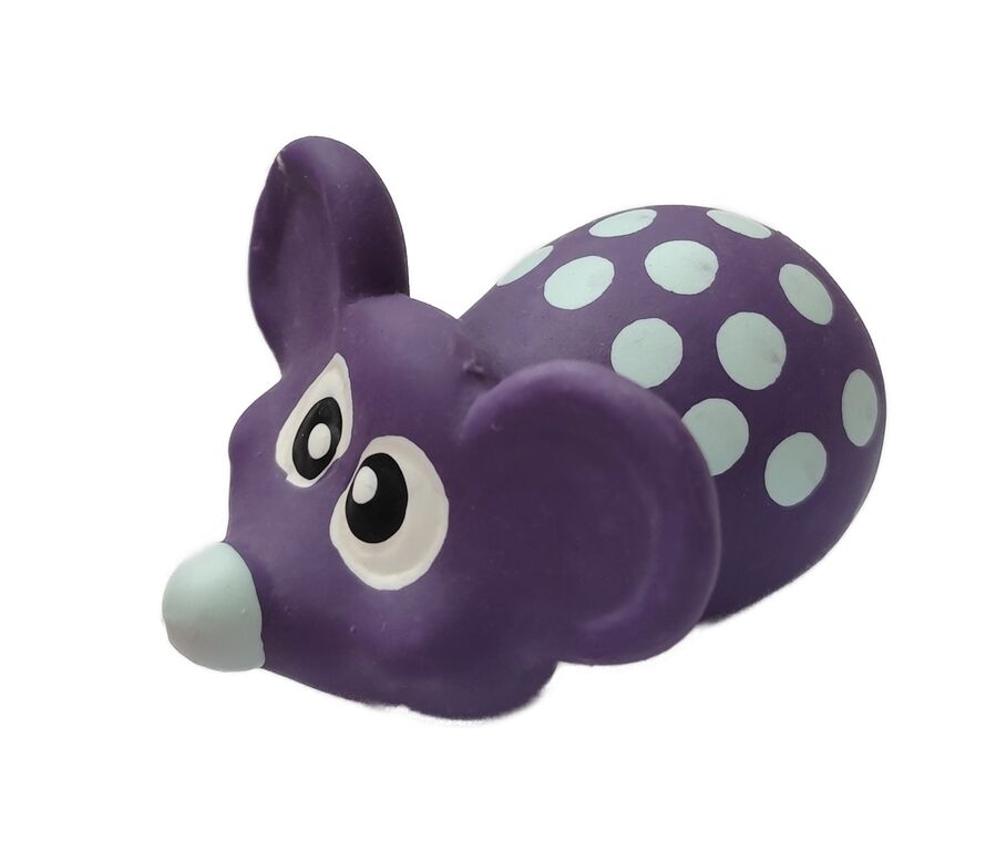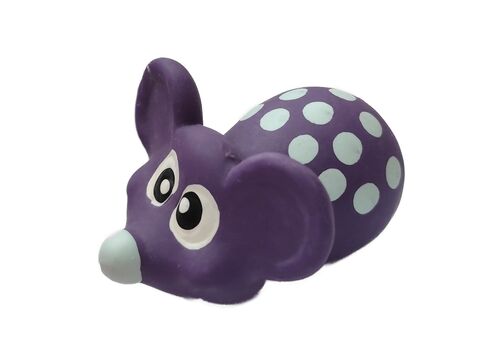 Zábavná latexová hračka pro malé psy nebo štěňata. Měkká, malá myška má veselý výraz a barevné puntíky na zádech. Hračka má vybarvený obličej a je vyplněná polyesterovým vláknem, takže drží svůj tvar a zůstává lehoučká. Povrch působí na omak sametovým dojmem. Uvnitř tělíčka je skryté pískátko, které vydá zvuk při rychlém stisknutí. Pískání motivuje psa k další hře a dělá hru ještě zábavnější.