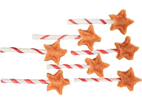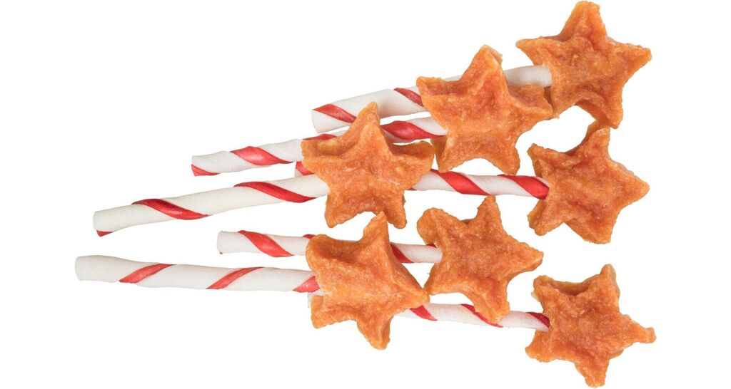 Hvězdičky jsou z kuřecího separátu a škrobu, tedy pevné, přischlé směsi, kterou lze rukou těžko odlomit a pes si ji bude muset chvíli požužlat, než povolí. Buvolí tyčinka je pak žvýkačka, která ho zabaví na delší dobu.