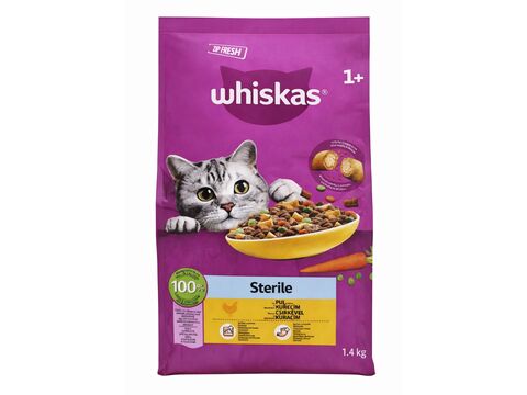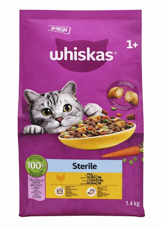Kompletní krmivo pro dospělé kastrované kočky. Granule obsahují optimální poměr vitamínů a minerálů pro jejich potřeby a zdraví. Podporuje přirozenou obranyschopnost taurinem a vitamínem E. Vysoce kvalitní kuřecí bílkovina je lehce stravitelná. Granule pro kočky Whiskas sterile mají speciálně upraven obsah minerálních látek, tak aby zajistil optimální výživu kastrované kočce a nezatěžoval močové cesty. Složení s nižším obsahem kalorií pomáhá udržovat ideální hmotnost kočky. Přidaná přírodní vláknina z čekanky a celulóza přispívá k zdravému trávení a podporuje zdravou střevní mikroflóru.